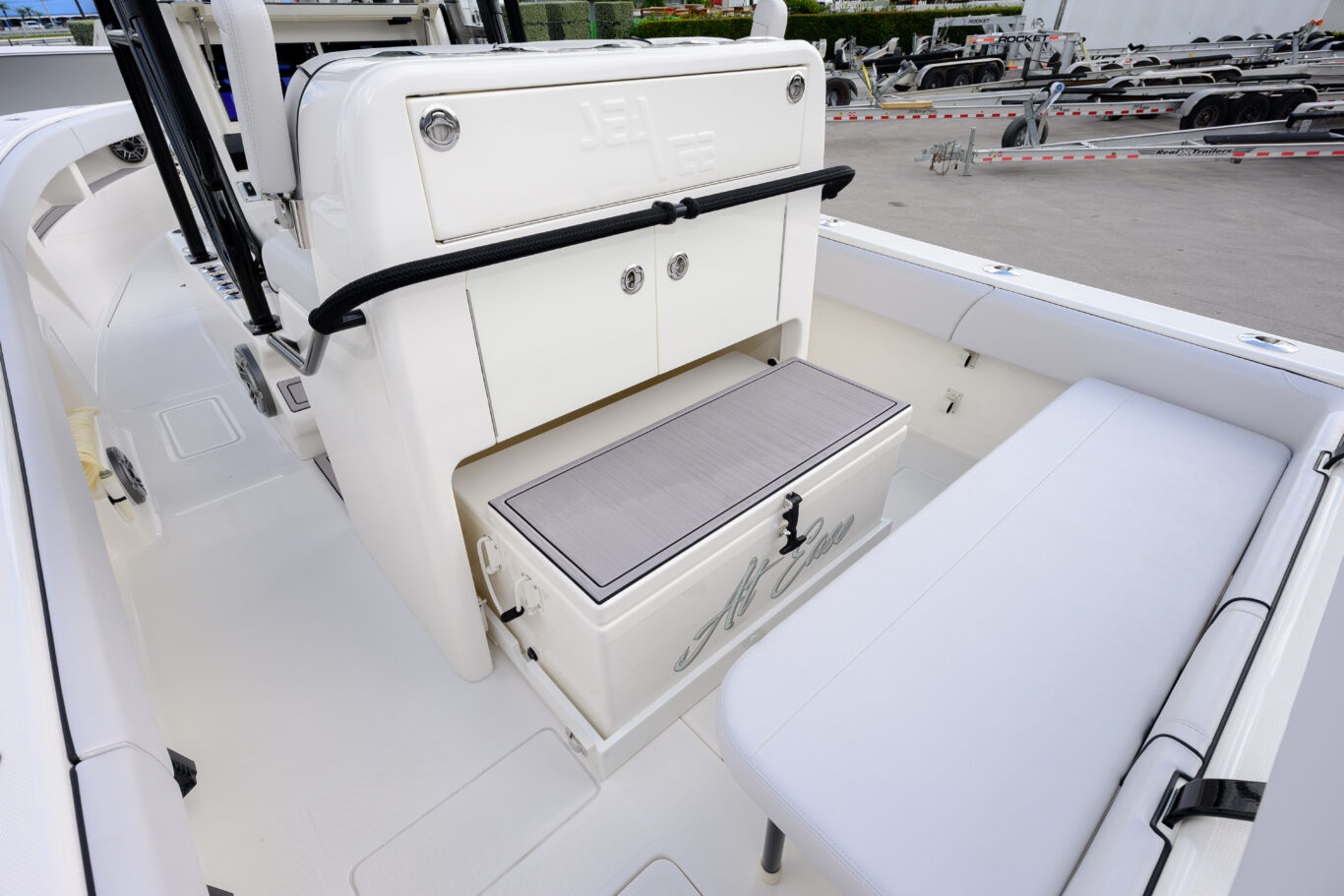 Captains’ edition Helm seat prep station with Slide out fiber glass cooler/ folding arm rest