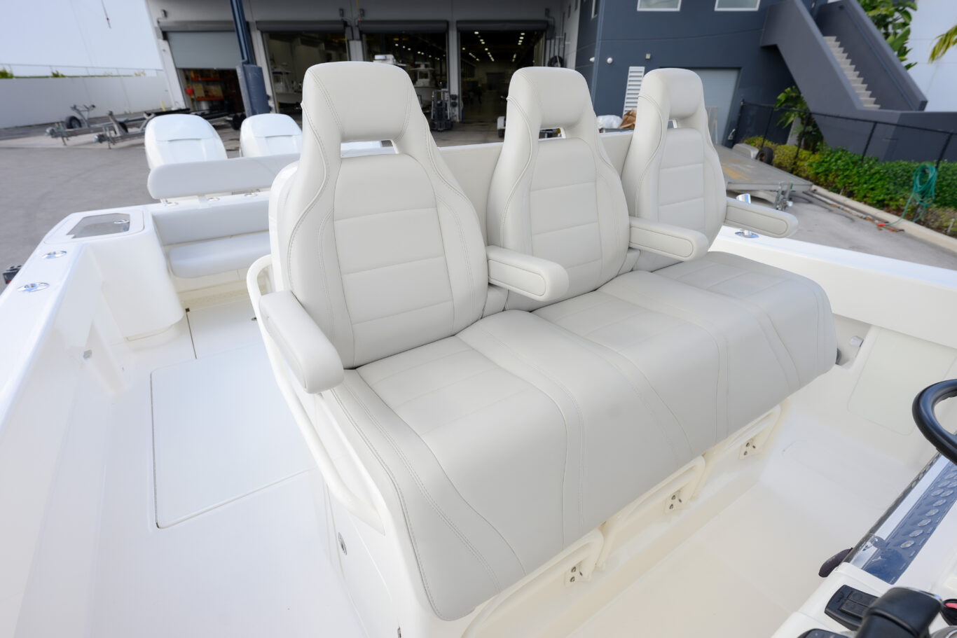 Oversized Captains Edition Leaning post with Prep Station Triple Seat backrest upgrade and Fiberglass slide out Cooler with optional seat cushion