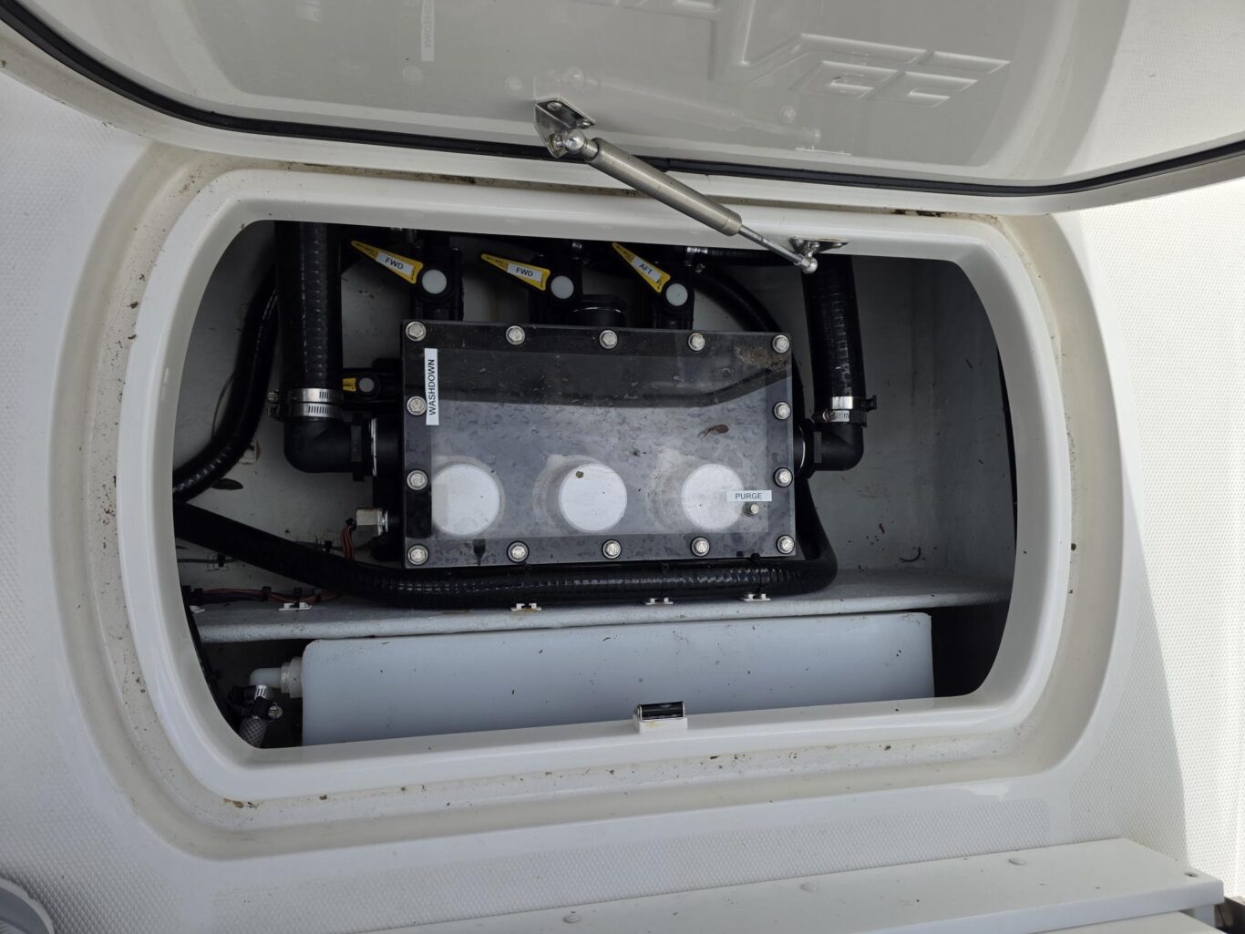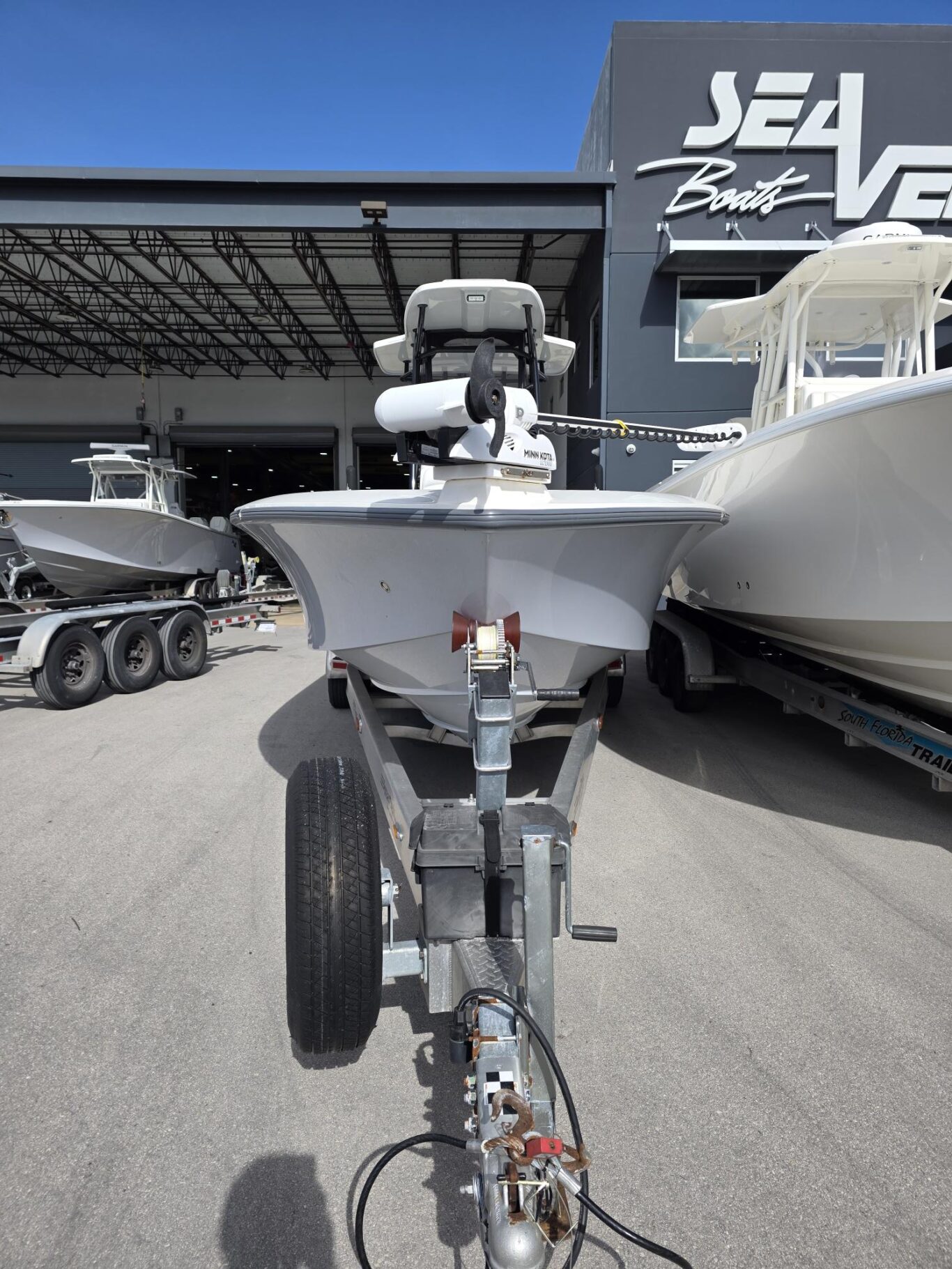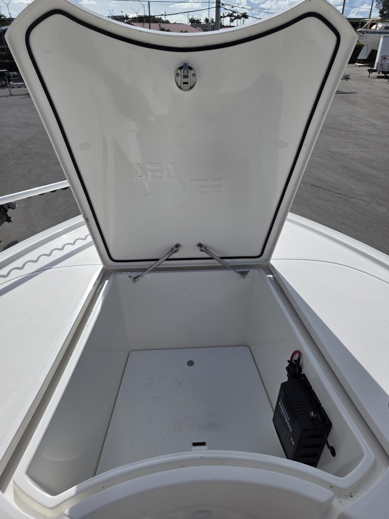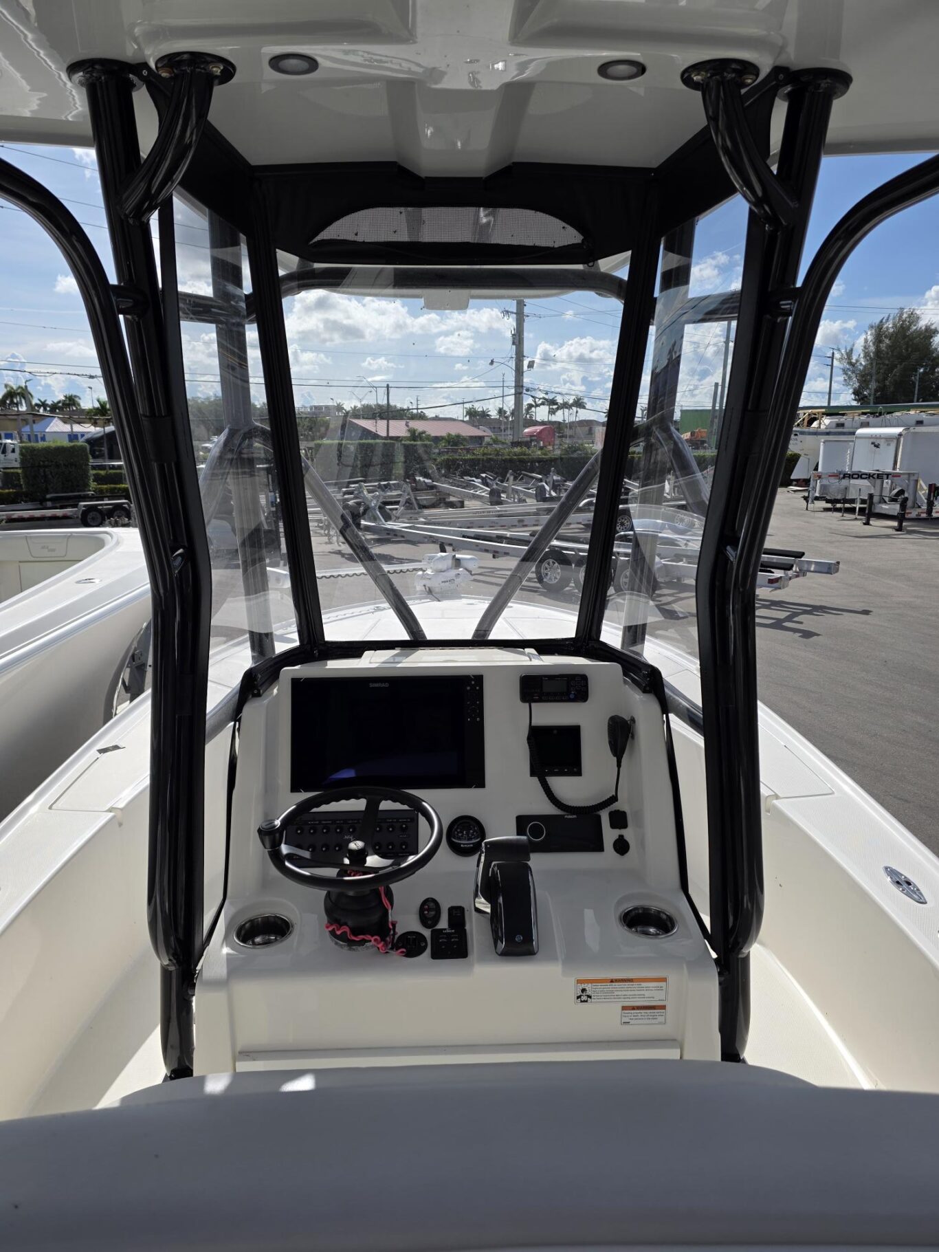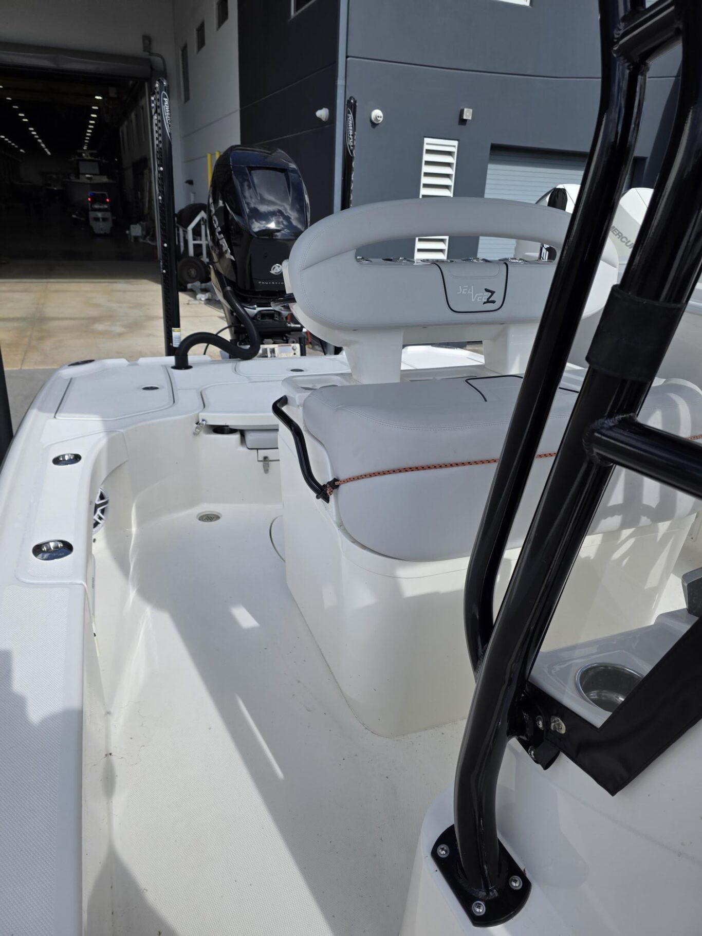 Fiberglass molded Hard-Top, Lumitec razr lightbar, 13″ Black Edson wheel, 2 Under Water lights, Fresh and Saltwater washdown, 72″ Minn Kota Ulterra 36v Trolling motor, 2 Power Pole 10′, Custom SS SeaChest 3 pump, 8 Rod Holders, 11 Console Rod holders, Coastal Leaning Post, Fiberglass Cooler 105qt with Sliding cooler, Three panel Polycarbonate Enclousure